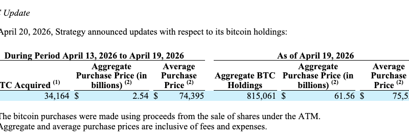 Strategy acquired 34,164 Bitcoin (BTC) for $2.54 billion between April 13 and 19, according to an 8-K filing with the US Securities and Exchange Commission on Monday.