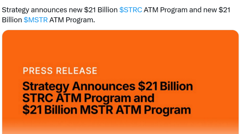 Strategy plans to raise up to $21 billion by selling Strategy (MSTR) stock and another $21 billion from its high-yield perpetual preferred stock, Stretch (STRC), via new at-the-market programs, the company said in an 8-K filing to the US Securities and Exchange Commission on Monday.