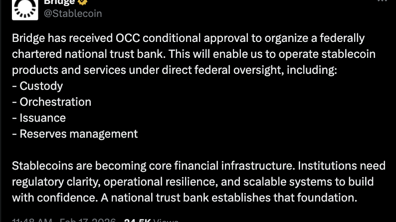 According to OCC records, Bridge applied for a bank charter in October and was given approval on Feb. 12. Stripe acquired the platform in 2025 as part of a $1.1 billion deal for the company to support stablecoin payments.