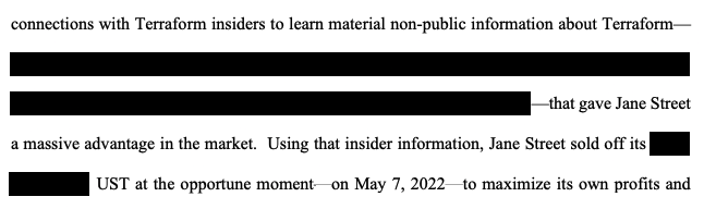 The heavily redacted complaint claimed Jane Street used connections with “Terraform insiders to learn material non-public information” about the company and used the information to sell off tokens tied to the Terra blockchain that worsened its collapse.