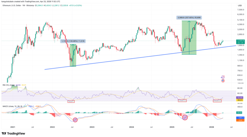 “$ETH weekly MACD bullish cross is now confirmed,” analyst Ash Crypto said in a recent X post, adding:
