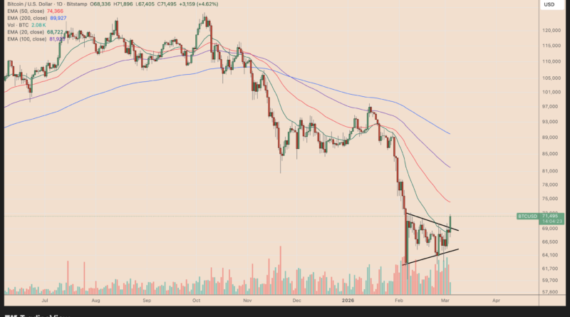 The BTC/USD pair pierced the pennant’s upper trend line after jumping 5.21% to around $71,900. Its breakout came alongside a rise in trading volume, implying stronger conviction behind the rally.