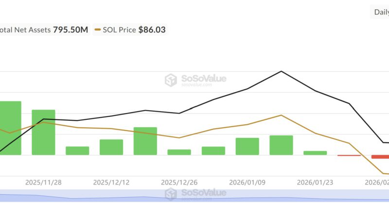Spot SOL ETFs launched in late October 2025, drawing over $100 million in average net inflows during their first five weeks. Since December 2025, the weekly inflows have decreased, averaging $20 million to $25 million as SOL price slid to $86 in February 2026.