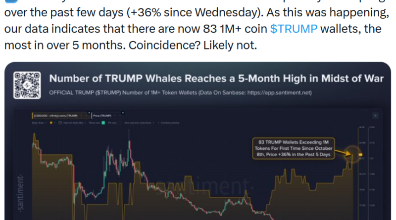 There are now 83 wallets holding more than 1 million TRUMP (TRUMP) (equating to $3.7 million), making it the highest showing for the memecoin since Oct. 8 last year, Santiment said in an X post on Monday.