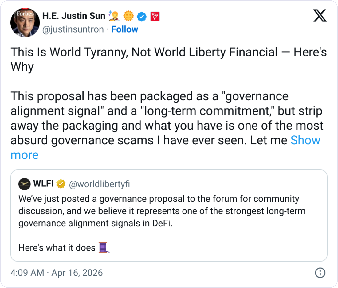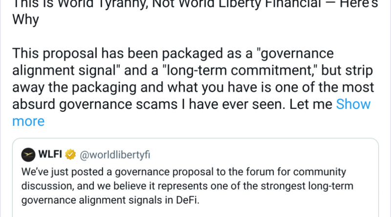 He also took issue with being “forced out of this voting process” due to World Liberty’s freeze of his tokens and claimed that a “large number of holders with significant voting rights are in the same position.”