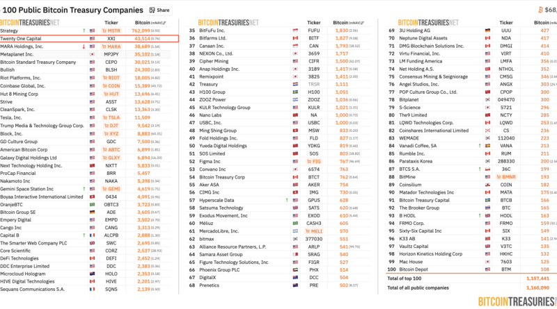 Twenty One Capital becomes the second-largest BTC treasury company by BTC holdings. Source: BitcoinTreasuries