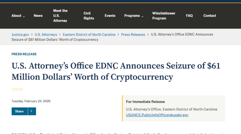 US Federal agents in North Carolina seized more than $61 million worth of USDt (USDT) tied to a large‑scale “pig butchering” crypto investment scam that preyed on victims through fake online relationships and fraudulent trading platforms.