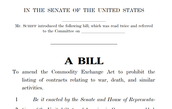 The bill seeks to ban prediction market contracts that involve references to “terrorism, assassination, war, or any similar activity,” or that are related to an “individual’s death.” The bill was referred to the Senate Committee on Agriculture, Nutrition, and Forestry for consideration, where Schiff is a member.