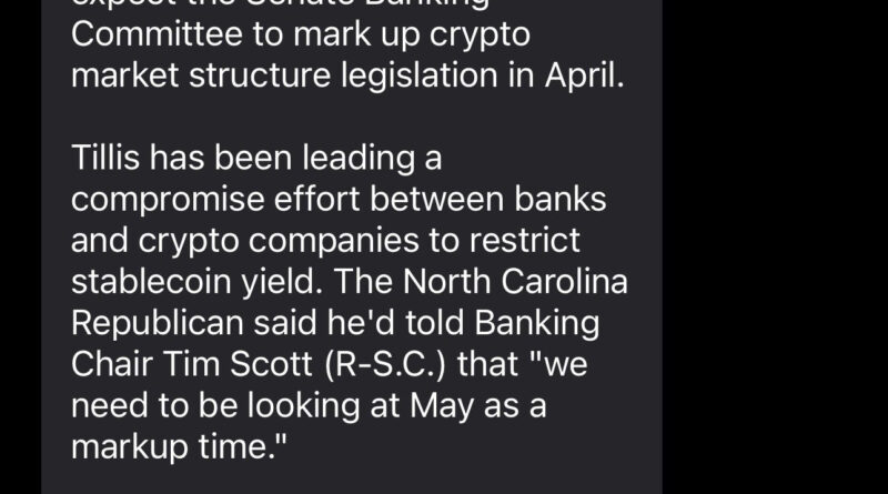 US Republican Thom Tillis of North Carolina told reporters Monday that he does not expect the Senate Banking Committee to mark up the legislation, also known as the CLARITY Act, in April and has recommended that Scott schedule it for next month, according to Punchbowl News.