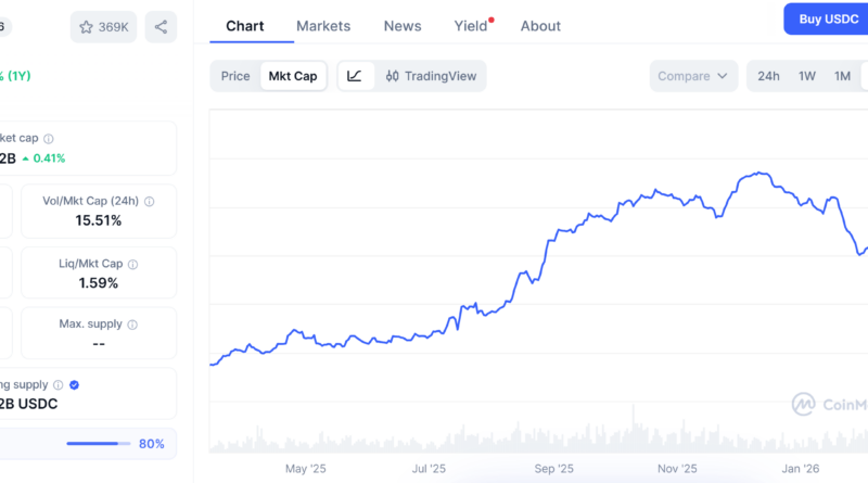 According to data from CoinMarketCap, USDC (USDC)’s circulating supply has risen to roughly $79.2 billion, marking a new all-time high for the dollar-pegged stablecoin. The stablecoin’s market cap previously hit a high of below $79 billion in December last year.