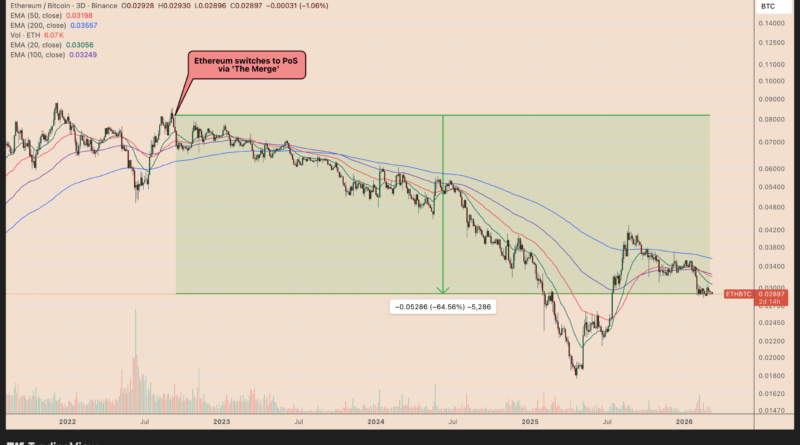 Ether (ETH) has dropped roughly 65% against Bitcoin (BTC) since Ethereum’s 2022 shift to Proof-of-Stake (PoS), casting doubt on the network’s “ultrasound money” thesis.