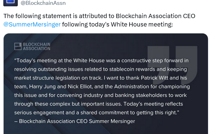 Blockchain Association CEO Summer Mersinger said the meeting was a “step forward” toward resolving issues related to stablecoin rewards and advancing legislation on the crypto market structure.