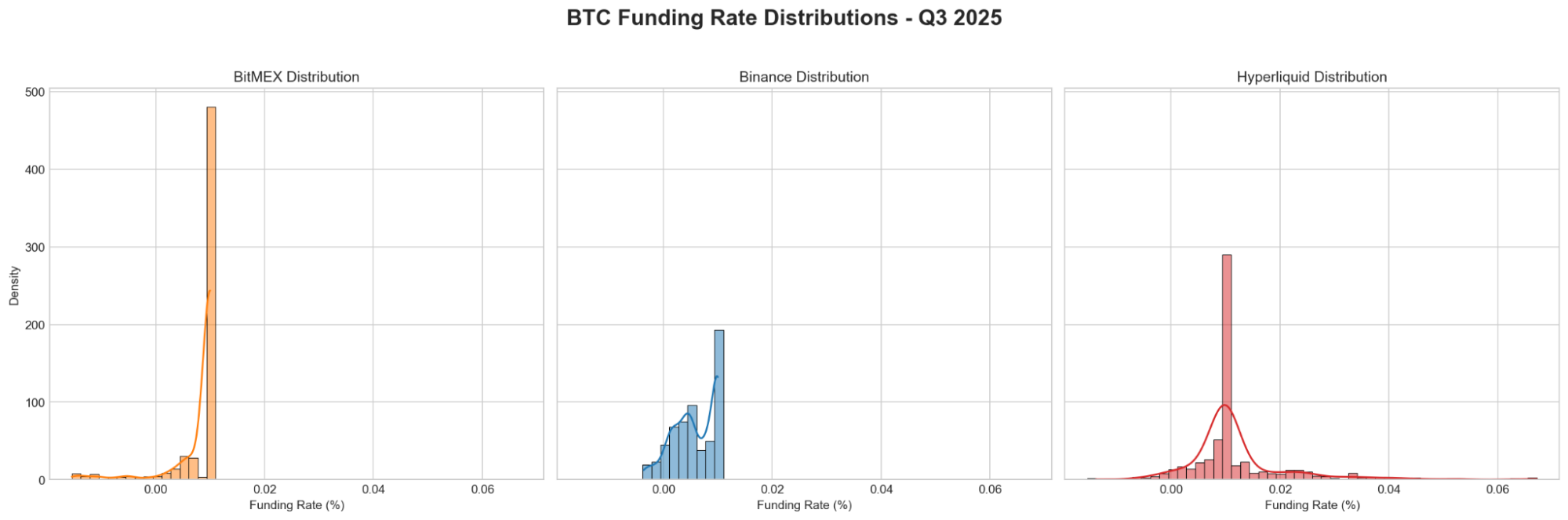 To analyse whether the above thesis on funding rates’ floor and ceiling stand true, we analysed funding rate data from Q3 2025 across BitMEX, Binance, and Hyperliquid. This confirmed the two core theories discussed in the previous section: