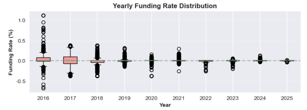 Over the years as the market deepened and more institutional capital flowed in, this volatility subsided. The 2024-2025 cycle established a new normal: the average funding rate now consistently hovers around a baseline of 0.01%/8-hour. This occurs when the perpetual contract’s premium is minimal, causing the rate to default to its interest rate component—a sign of a systematically efficient financial market.