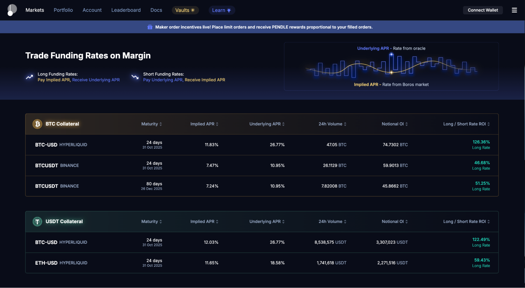 Navigate to the Boros platform and connect your wallet. Based on your thesis, you will either long or short the implied funding rate.